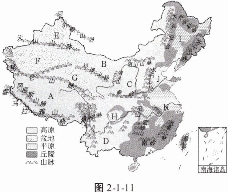 2. 读中国主要地形区图(图 2-1-11),写出图中字母代表的地形区名称。