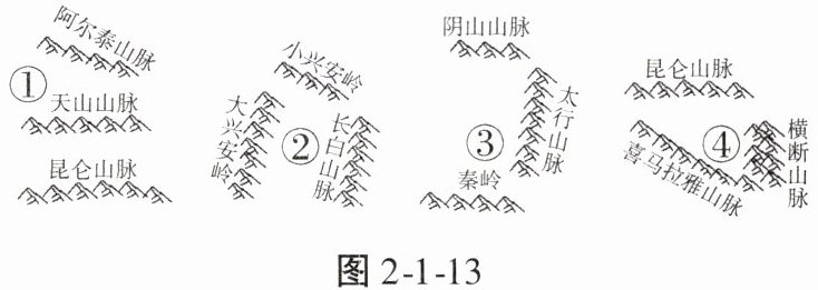 纵横分布的山脉,构成了我国地形的骨架。图 2 - 1 - 13 示意我国部分山脉的分布。据此完成 3、4 题。