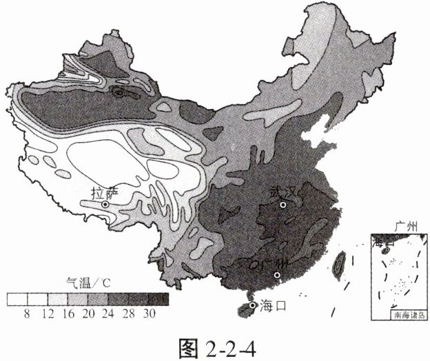 读中国 7 月等温线分布图(图 2 - 2 - 4),完成 1、2 题。
