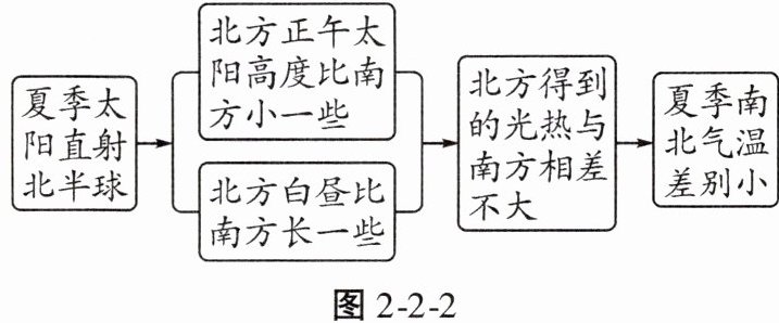 (2)我国夏季南北气温差别小的原因(图 2-2-2)。