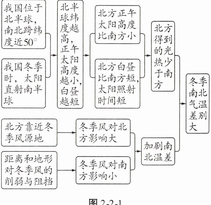 (1)我国冬季南北气温差别大的原因(图 2-2-1)。