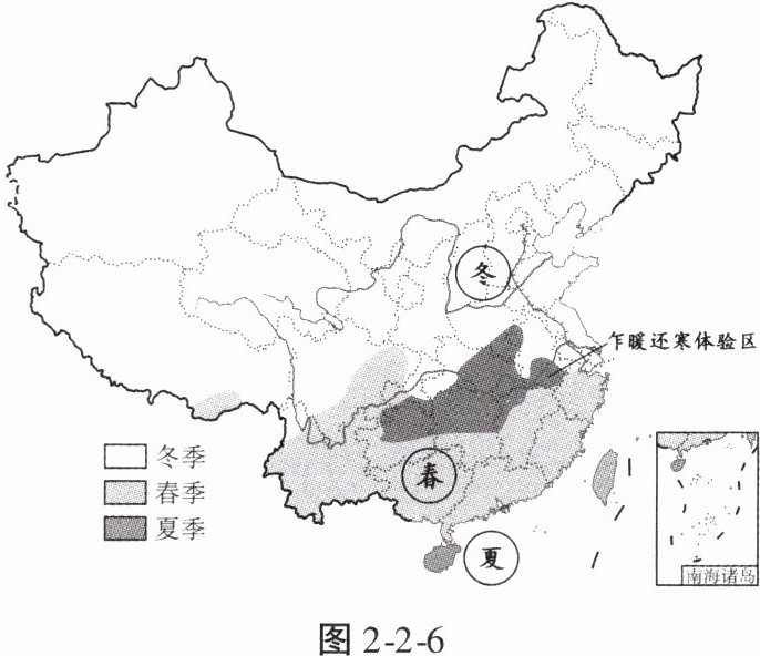 (2024·成都中考)2024 年 3 月初,我国南方大部分地区已进入气象学意义上的春天,但部分地区仍乍暖还寒,体感上依旧寒冷。图 2 - 2 - 6 示意 3 月 6 日全国入春进程。据此完成 7—9 题。