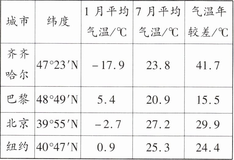 我国东部是典型的季风气候区。读中国东部两个城市与世界纬度相近城市的气温数据表(表 2 - 2 - 1),完成 5、6 题。