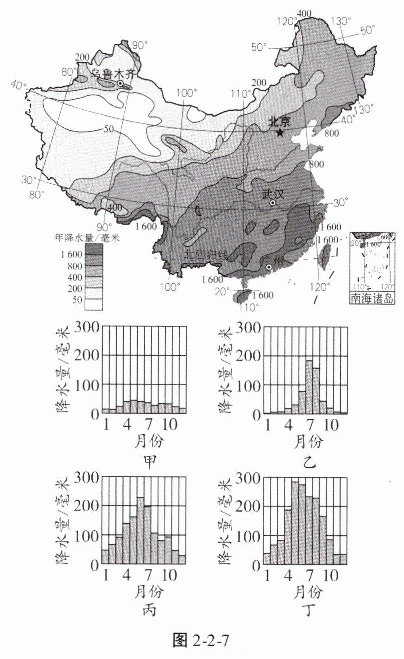 (2023·北京中考改编)分析降水量分布状况是认识区域差异的重要内容。图 2 - 2 - 7 为中国年降水量的分布和四地多年平均各月降水量图。读图,完成 10—12 题。