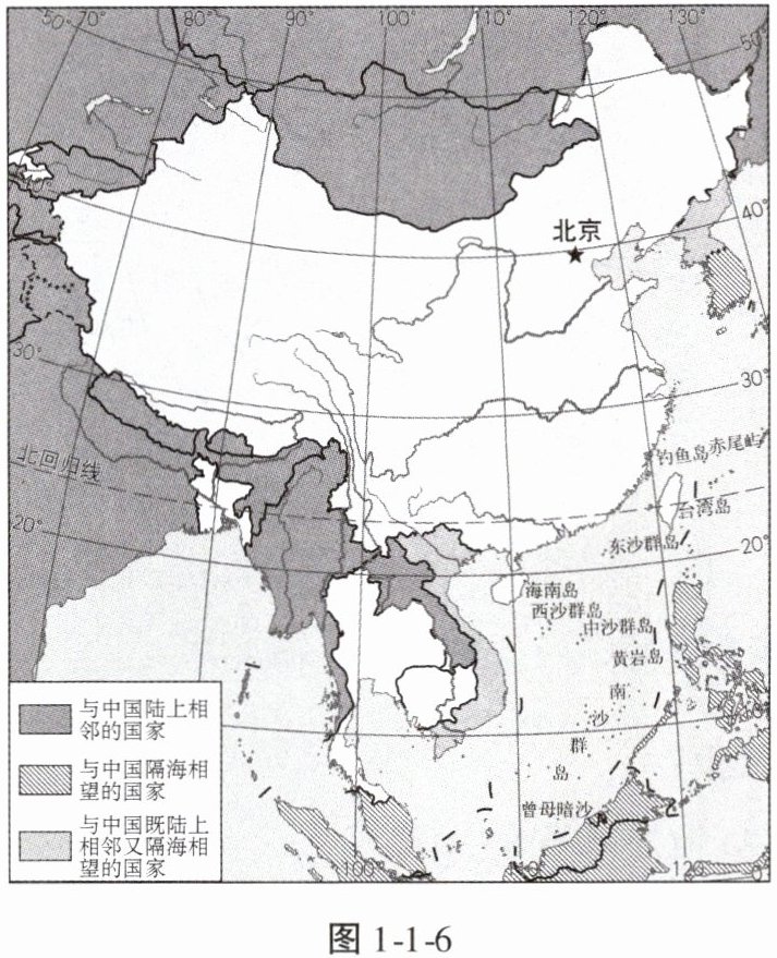 某电视台要拍摄一部《中国万里行》的风光纪录片,其中一套方案是乘船由北向南游览我国大陆海岸线。图1-1-6示意中国的疆域及邻国。据此完成4—6题。