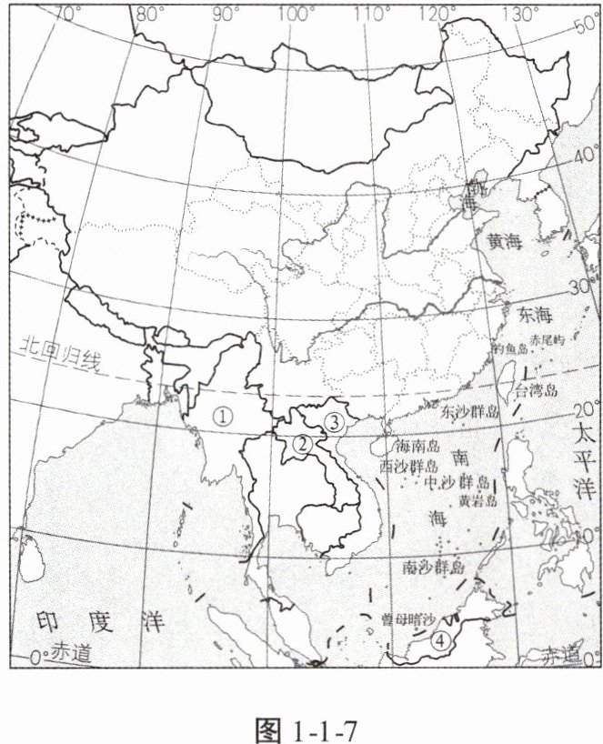 10. 2024年8月29日是我国第21个测绘法宣传日,了解国家版图、认知国家版图、树立国家版图意识,自觉维护国家主权与领土完整,是每个公民的责任和义务。某中学地理兴趣小组举行了以“一点一线皆山河”为主题的探究活动,探究中国的疆域及海洋权益的维护。读中国的疆域及邻国图(图1-1-7),完成下列问题。