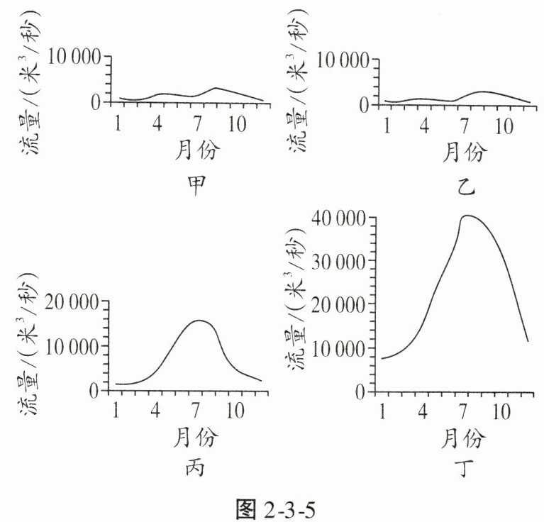 读中国东部四条河流的流量年变化曲线示意图(图2-3-5),完成7、8题。
