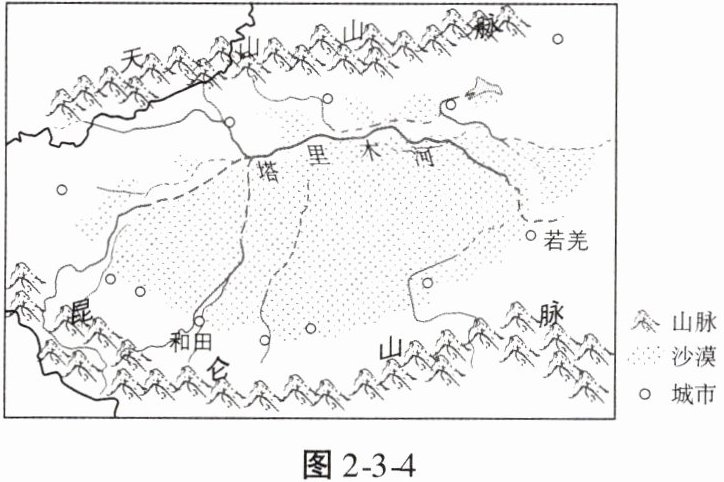 (2025·定边期中)自2000年以来,新疆已多次向塔里木河下游实施生态输水,“滋润”每一段干涸的河道和两岸植被。图2-3-4示意塔里木河位置。据此完成5、6题。