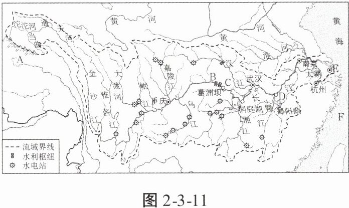 4. 读长江流域水系图(图2-3-11),写出图中字母代表的地理事物名称。