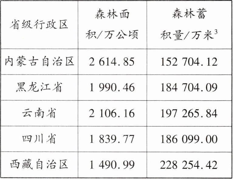 森林蓄积量是指一定森林面积上树干部分的总体积。森林蓄积量越大反映该地区森林资源越丰富。读中国主要省级行政区森林面积与蓄积量统计表(表 3 - 1 - 5),完成 8、9 题。