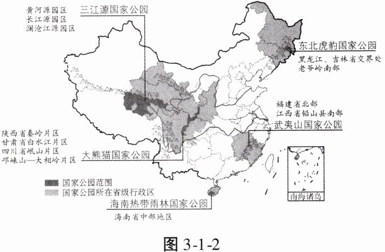 到 2035 年,中国将基本建成世界最大的国家公园体系——49 个国家公园,总面积约 110 万平方千米。读中国第一批国家公园示意图(图 3 - 1 - 2),完成 10、11 题。