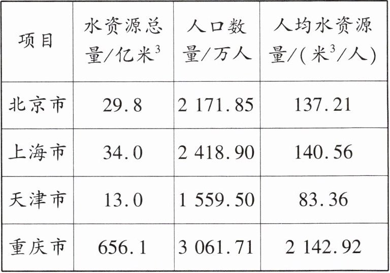 (2024·福建中考)我国四个直辖市的水资源存在差异。读某年四个直辖市的水资源与人口状况表(表3-2-3),完成7—9题。