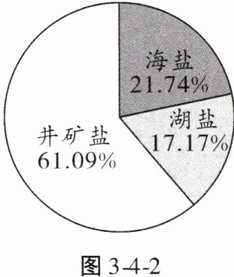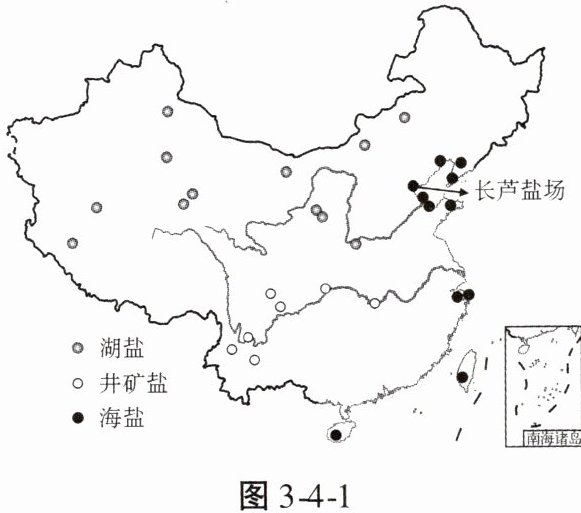 盐广泛应用于食品、工业生产等领域,根据来源可分为海盐、湖盐、井矿盐,制取方式也不相同,其中制取海盐普遍采用日晒法,长芦盐场是我国最大的盐场。目前,我国盐年产量居世界第一,出口量不断增加。图3-4-1为中国主要盐场分布图,图3-4-2为中国盐的来源结构图。据此完成1—3题。