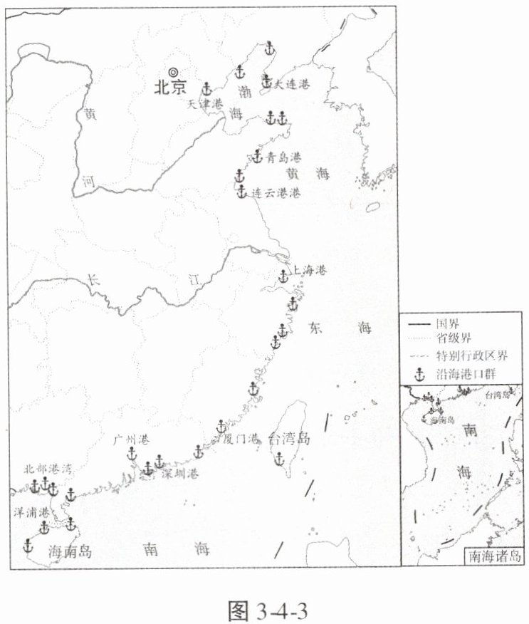 我国某外贸公司计划将一批电子产品从上海运往欧洲鹿特丹,选择海运路线。结合中国沿海地区的港口群图(图3-4-3),完成4、5题。