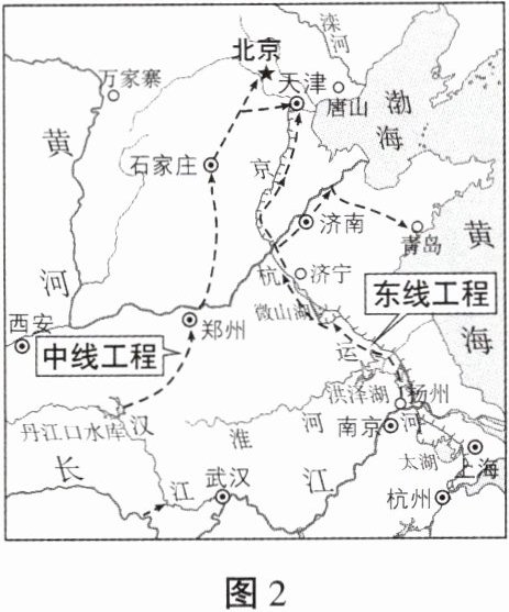 南水北调中线、东线工程已建成通水多年,“南水”成为沿线多座城市的重要水源,该工程发挥了显著的社会效益、经济效益和生态效益。读南水北调中线工程线路示意图(图2),完成4—7题。