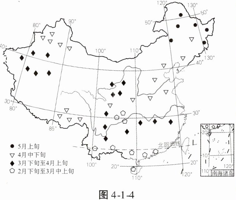 的地区。(2) 读图 4 - 1 - 4 可知,广西壮族自治区开始春耕的时间大致是