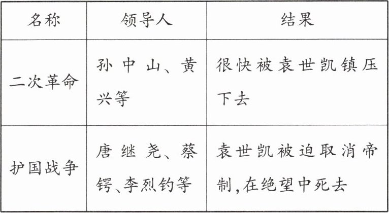 |护国战争|唐继尧、蔡锷、李烈钧等|袁世凯被迫取消帝制,在绝望中死去|