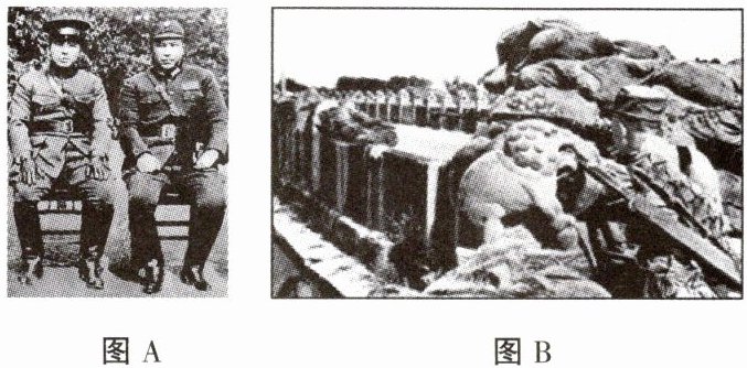 (1)材料一图A中的人物______和杨虎城于1936年12月12日在西安扣押蒋介石,实行“兵谏”,并通电全国,要求停止内战、一致抗日。图B是______年7月7日,驻卢沟桥的中国守军准备战斗。1938年,毛泽东发表了《______》,从理论上说明:日本帝国主义侵略战争是退步、野蛮的,失道寡助;中国反侵略战争是进步、正义的,得道多助。1940年,在枣宜会战中,第三十三集团军总司令______率部英勇作战,壮烈殉国。(4分)