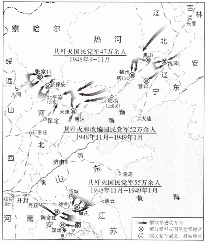 (4)战役:辽沈战役、淮海战役、平津战役。影响:国民党军队的主力基本被消灭,大大加速了人民解放战争在全国的胜利。