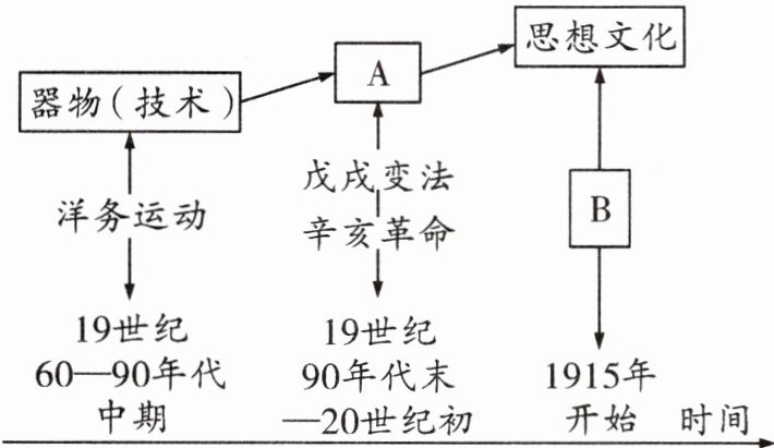 (1)A:制度。B:新文化运动。特点:中国近代化探索经历了学习西方先进技术—制度—思想文化的历程,由浅入深,由表及里。