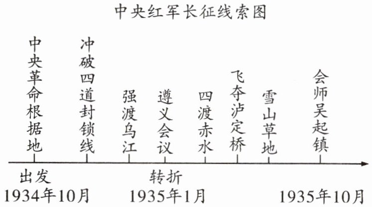 ①中央红军出发时间 ②遵义会议是转折点 ③长征中的重大事件 ④红军三大主力会师的时间