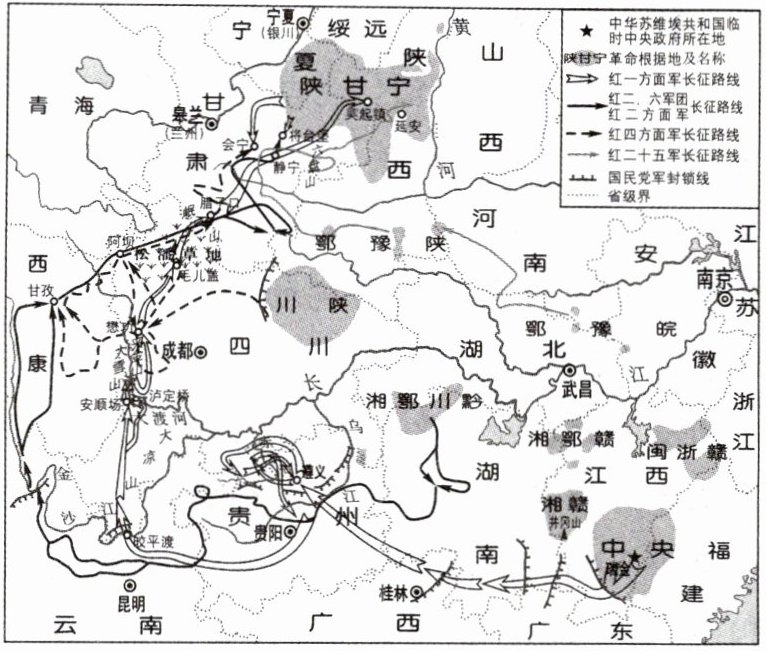 B [解析]结合所学知识可知,图片反映的是新民主主义革命时期红军长征的过程,革命中心从南方转移到北方,B项正确。南昌起义后,军队名称从国民革命军到工农革命军,排除A项;国民革命失败后,斗争对象从反对北洋军阀到武装反抗国民党反动派,排除C项;从和平改革到暴力革命与图片无关,排除D项。