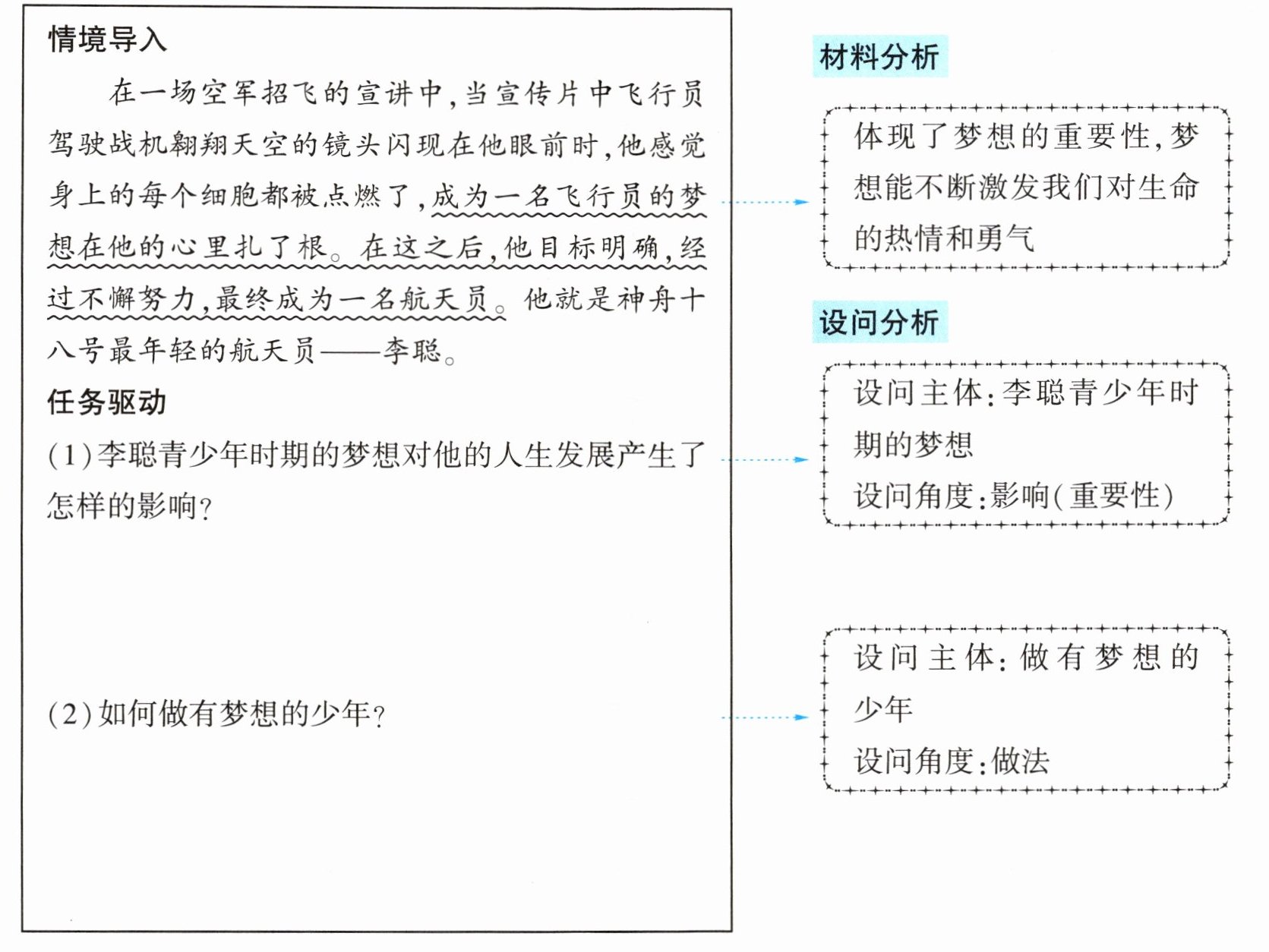 (2) ①做有梦想的少年,应当树立远大志向。志向是人生的航标,是奋斗的原动力。我们要早立志,立大志,立长志。②做有梦想的少年,应当紧扣时代脉搏。我们要努力成为担当民族复兴大任的时代新人。