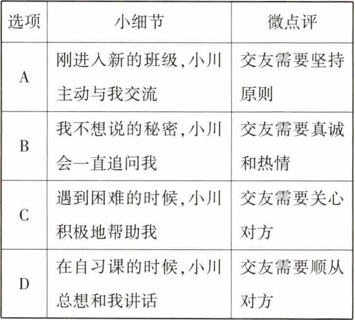 C 【解析】本题考查交友的智慧。刚进入新班级,小川主动与"我"交流,体现了交友需要真诚和热情,A 点评错误。"我"不想说的秘密小川一直追问,这种做法是错误的,交友要把握好彼此的界限和分寸,B 点评错误。遇到困难时小川帮助"我",体现了交友需要关心对方,C 点评正确。自习课小川总想和"我"讲话,这是不正确的行为,交友要讲原则,D 点评错误。