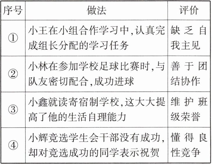 |①|小王在小组合作学习中,认真完成组长分配的学习任务|缺乏自我主见|