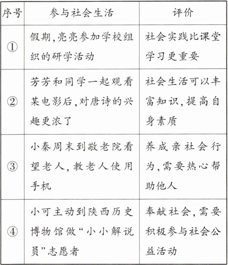 校组织的研学活动|社会实践比课堂学习更重要||②|芳芳和同学一起观看某电影后,对唐诗的兴趣更浓了|社会生活可以丰富知识,提高自身素质|