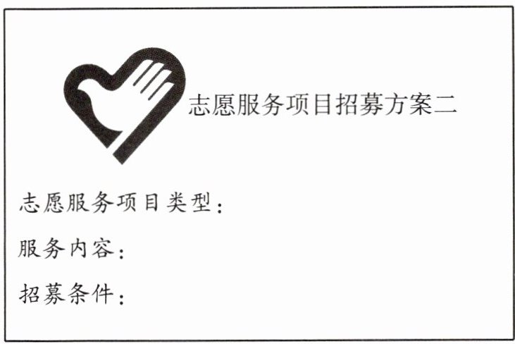 材料三 志愿服务已成为推动公民道德建设和社会和谐的重要力量。班级同学在小秦的号召下,成立了志愿服务社团来吸引更多同学加入志愿服务的队伍。该社团目前正在撰写不同类型的志愿服务项目招募方案,如下图所示。
