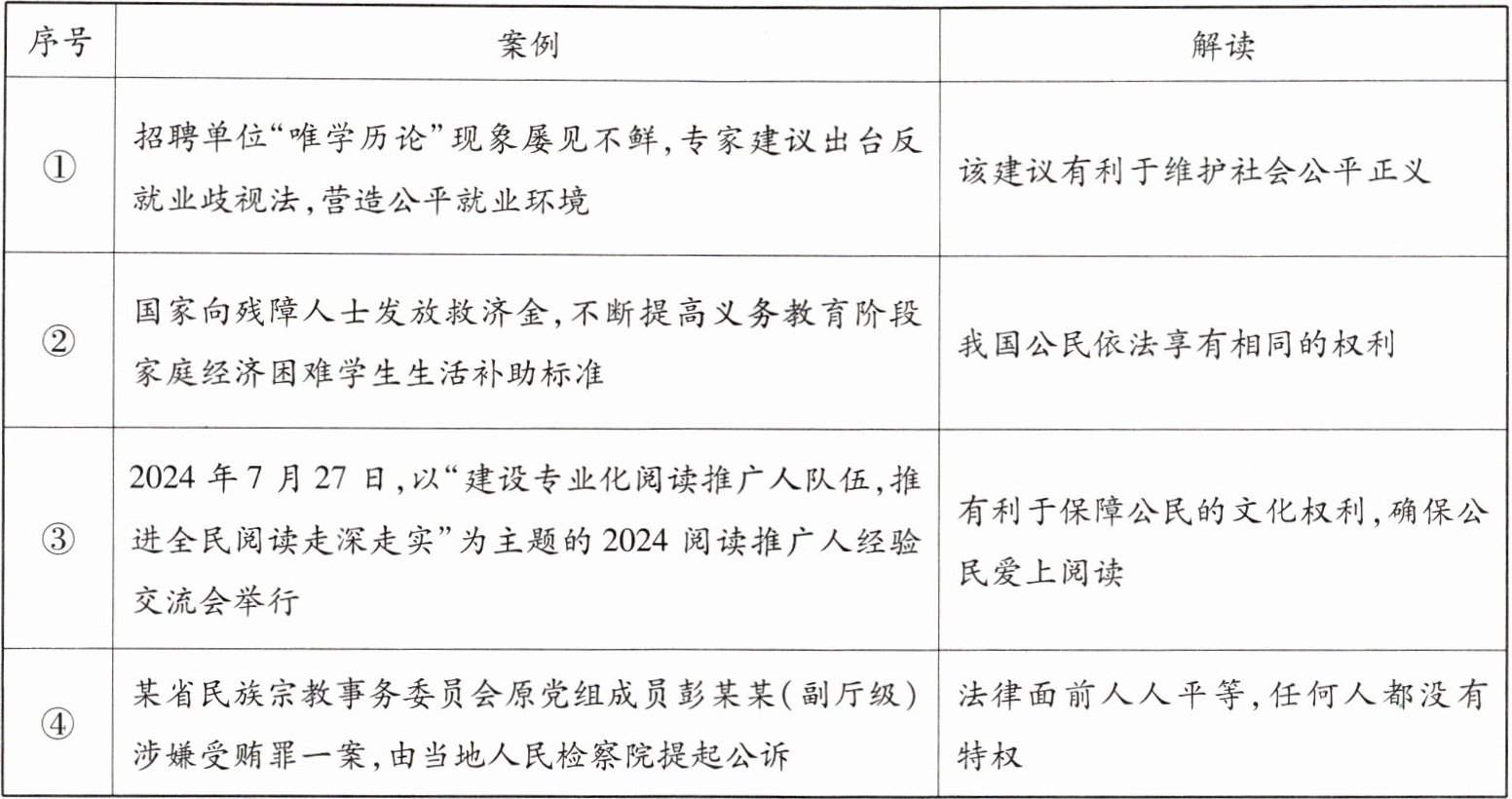 B 【解析】②"相同的权利"表述错误;③"确保"一词过于绝对,夸大了该活动的作用;①④案例与解读对应正确。