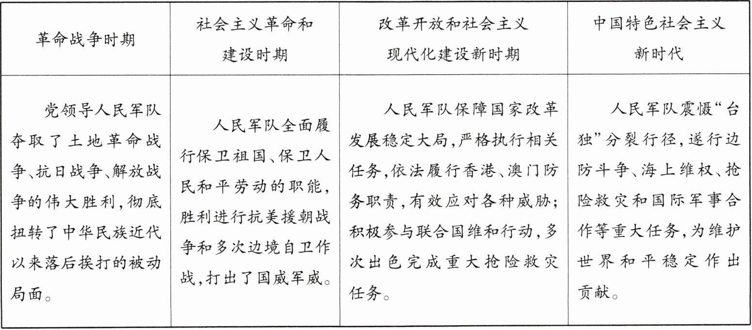(2)①从革命战争时期到中国特色社会主义新时代,人民军队始终在党的领导下前进,这表明人民军队是一支对党忠诚、听党指挥的军队。②党领导人民军队不断从胜利走向胜利,这表明人民军队是一支攻无不克、战无不胜的军队。③人民军队在各个时期严格执行党交代的任务,说明人民军队是一支纪律严明、作风优良的军队。④人民军队多次出色完成抢险救灾等任务,践行全心全意为人民服务的宗旨,说明人民军队是党和人民完全可以信赖的英雄军队。