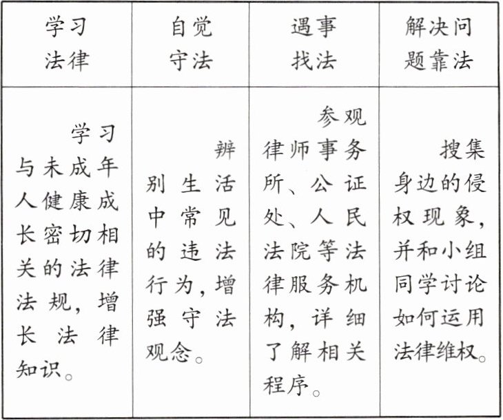 |学习与未成年人健康成长密切相关的法律法规,增长法律知识。|辨别生活中常见的违法行为,增强守法观念。|参观律师事务所、公证处、人民法院等法律服务机构,详细了解相关程序。|搜集身边的侵权现象,并和小组同学讨论如何运用法律维权。|
