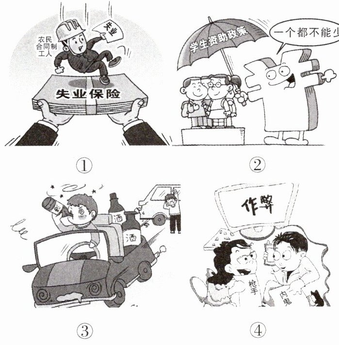 2. 正义是社会文明的尺度,表达了人们对美好社会的期待和追求。小秦整理了下面四幅漫画,能体现正义行为的有( )