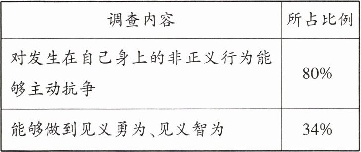 (1)①多数同学能够与发生在自己身上的非正义行为作斗争。②部分同学缺乏守护正义的责任感,不善于做到见义勇为、见义智为。