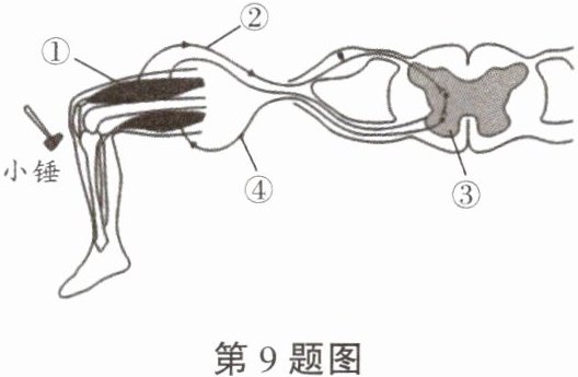 9. 医生常用膝跳反射来检测人体对刺激作出反应的情况。下图是膝跳反射的反射弧结构示意图,有关叙述错误的是( )
