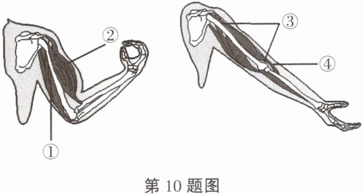 10. 下图是人的屈肘动作和伸肘动作示意图,与此有关的叙述正确的是( )
