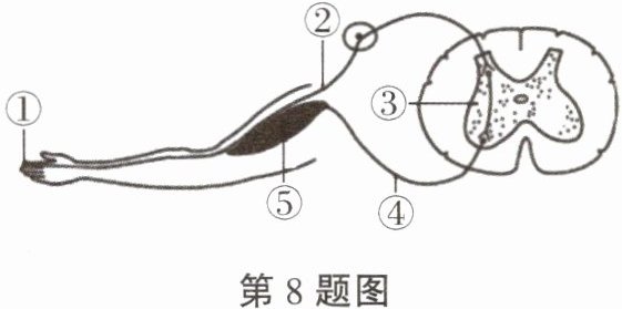 8. 【真实情境】某同学学做饭时,不小心触碰到了热的锅盖,手迅速缩回。下图为缩手反射活动示意图,有关分析错误的是( )