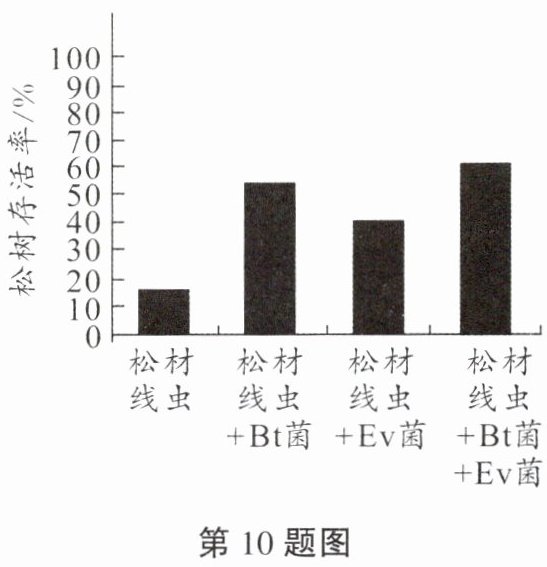 10. 【核心素养·科学思维】松材线虫病被称为松树的“癌症”,对我国的森林资源和生态安全造成了严重威胁。下图为研究小组使用 $ Bt $ 菌和 $ Ev $ 菌两种真菌进行松材线虫生物防治的实验结果。据图分析下列说法错误的是( )