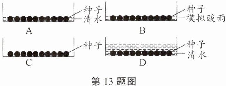 13. 【跨学科融合·化学】某校生物学兴趣小组为了探究种子萌发的环境条件和酸雨对种子萌发的影响,设计了如下实验: