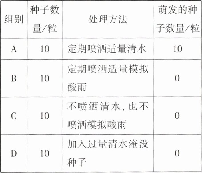 (4)在探究酸雨对种子萌发的影响时,变量是酸雨,该小组同学应从图中选择 A、B 两组装置作为对照实验。从表格中萌发的种子数来看,B 组种子萌发较少,A 组种子萌发较多,说明酸雨对种子萌发有影响。