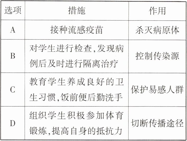 9. 【真实情境】(2024·宜宾中考改编)学校为了防止流感病毒的传播采取了多项措施。下列措施和作用对应关系最恰当的是(