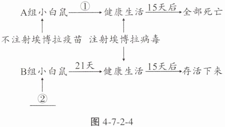 11. 【核心素养·探究实践】埃博拉出血热是由埃博拉病毒引起的,疫情发生后,许多国家先后开展了疫苗的研制工作。为检验疫苗的效能,科学家将小白鼠平均分为 A、B 两组进行了动物实验,过程如图 4 - 7 - 2 - 4 所示。请补充完善实验过程,回答相关问题: