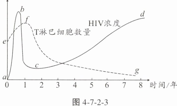 10. 【核心素养·科学思维】(2024·青岛中考)艾滋病是由 HIV 引起的人类免疫缺陷病,HIV 主要攻击人体的 T 淋巴细胞。图 4 - 7 - 2 - 3 为感染后,人体内 HIV 浓度和 T 淋巴细胞数量变化曲线。据图分析,不能得出的结论是(