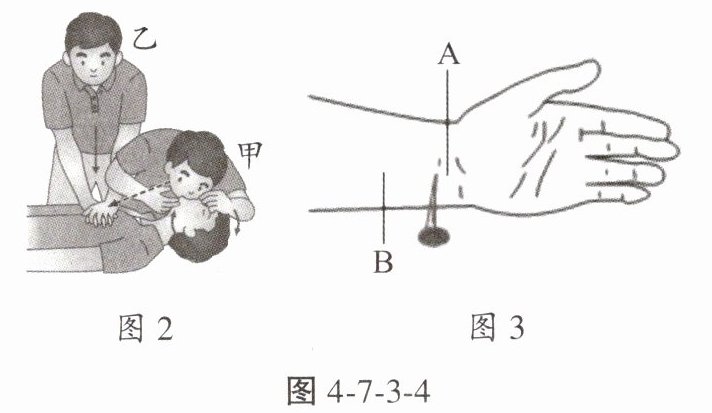 ;图 3 表示血液缓慢而连续不断从伤口流出,此时可按压A