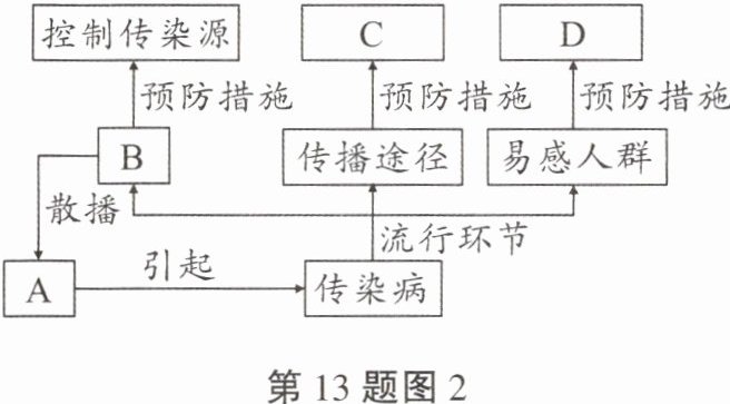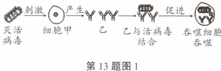 13. 每到冬春季节,由甲型流感病毒引起的急性甲流就来势汹汹,很多地区出现集中发热的现象,引起了人们的高度关注。接种疫苗是预防流感的有效措施之一。请根据所学知识回答下列问题: