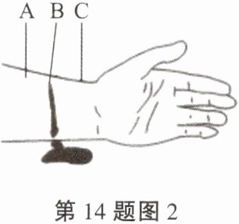 (2) 当同学们遇到外伤出血的患者时,应帮助其及时止血。如下图 2 所示,受伤部位 B 处血液呈暗红色并缓缓流出,则止血时加压或包扎的位点应在______(填字母)处。