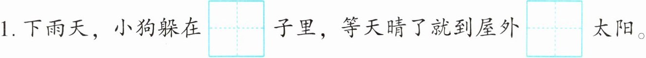 1. 下雨天,小狗躲在$\begin{array}{|c|}\hline \mathrm{w}ū \\ \hline\end{array}\\ \hline $子里,等天晴了就到屋外$\begin{array}{|c|}\hline \mathrm{sh}à\mathrm{i} \\ \hline\end{array}\\ \hline $太阳。