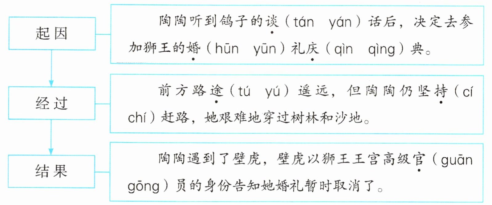 经过:前方路途(tú yú)遥远,但陶陶仍坚持(cí chí)赶路,她艰难地穿过树林和沙地。